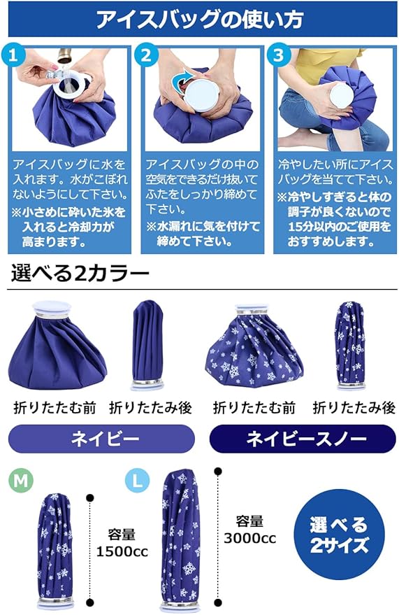 氷嚢 氷のう 2個セット 【使い勝手が良い M+Mセット L+Lセット】大口径 ひょうのう アイスバッグ スポーツ 氷枕 氷まくら アイシング(ネイビースノー M)