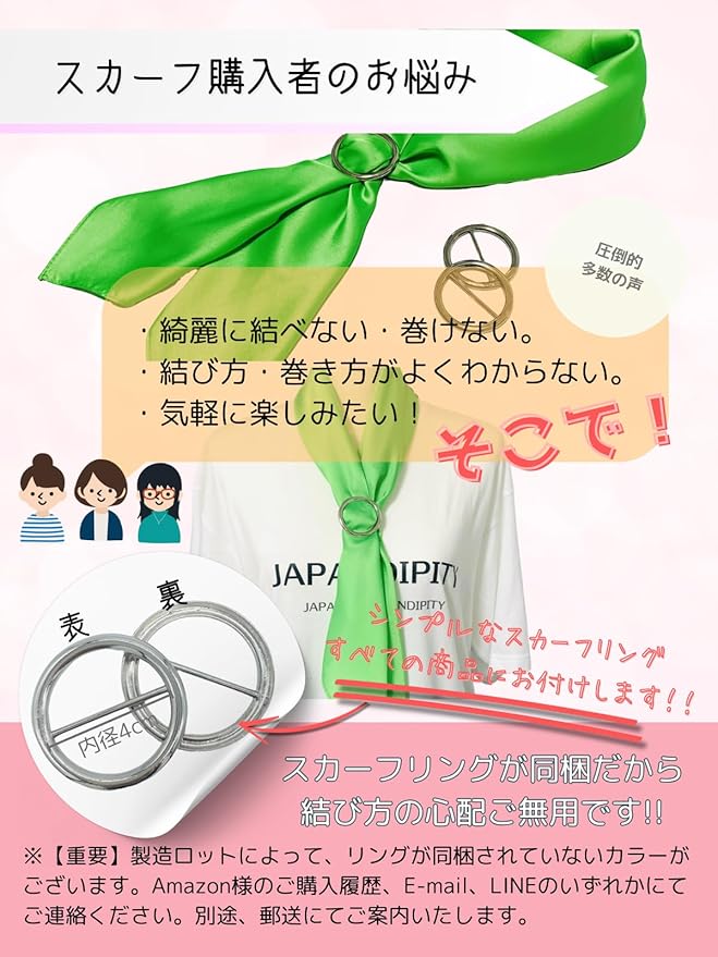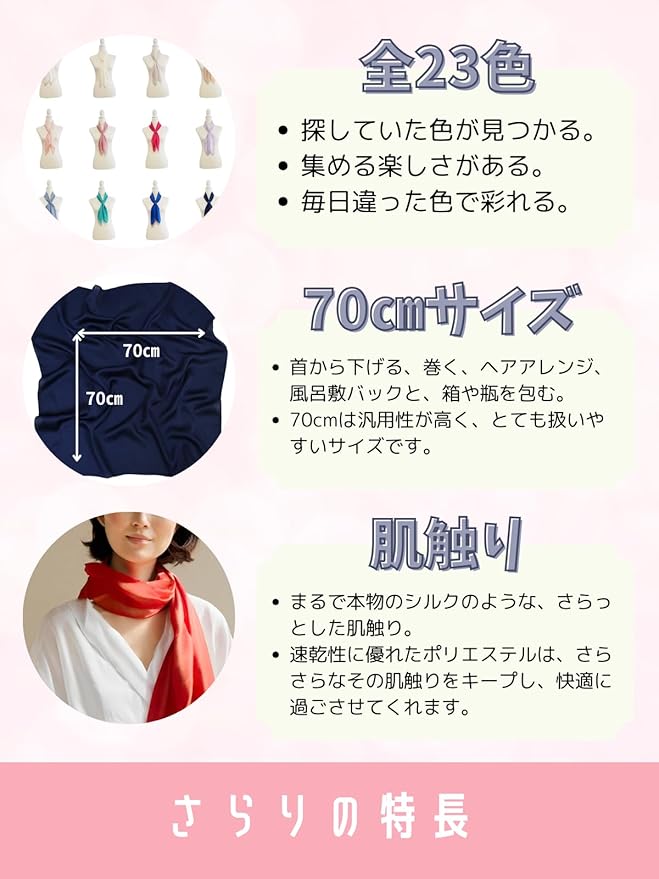 レディース スカーフ 70cm 無地 全23色 シルクタッチ ポリエステル - さらり【 スカーフリング セット】夏 大判