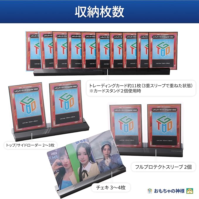 【素材】アクリル 【サイズ】15 3 1cm 【セット数】2個 【置ける枚数】カード 11枚(3重スリーブで重ねた状態)、トップ/再度ローダー 2~3枚、フルプロテクトスリーブ 2個