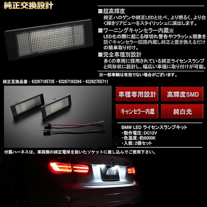 多くのBMWに採用されている純正ライセンスランプと同形状に設計し、 幅広い車種に取り付けが可能です。