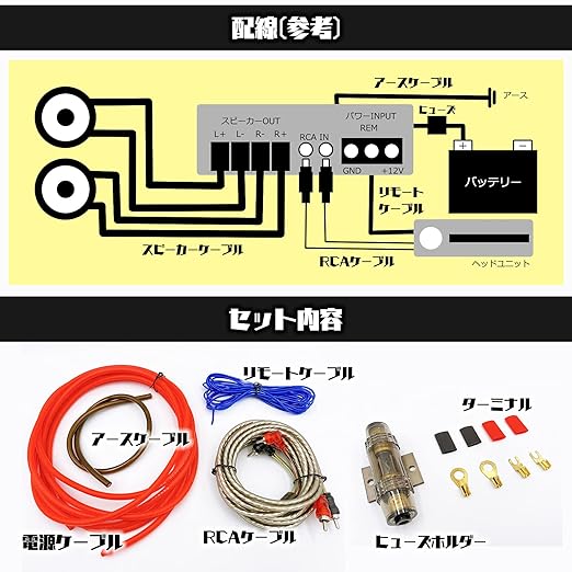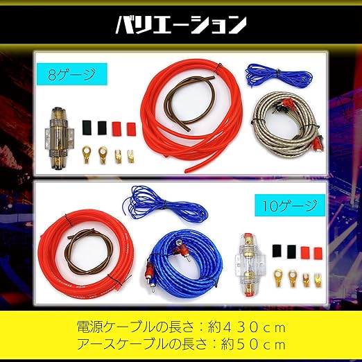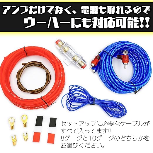 セット内容 【10ゲージ】 ・電源ケーブル (約430cm) ・アースケーブル (約50cm) ・リモートケーブル (約430cm) ・RCAケーブル (約450cm) ・平端子 2、丸端子 2、ゴムキャップ 4 【8ゲージ】 ・電源ケーブル (約430cm) ・アースケーブル (約50cm) ・RCAケーブル (約450cm) ・リモートワイヤー (約450cm) ・平端子 2、丸端子 2、ゴムキャップ 4