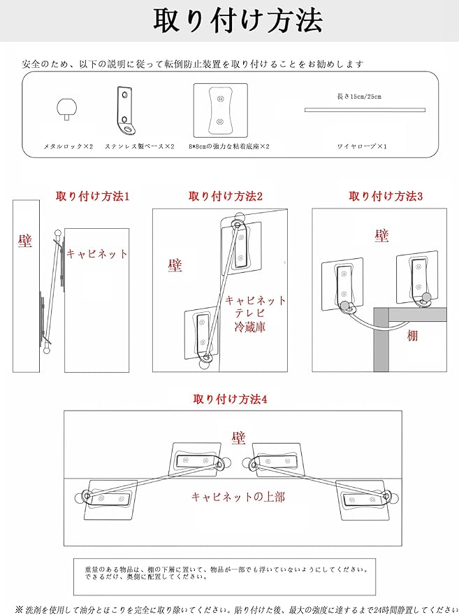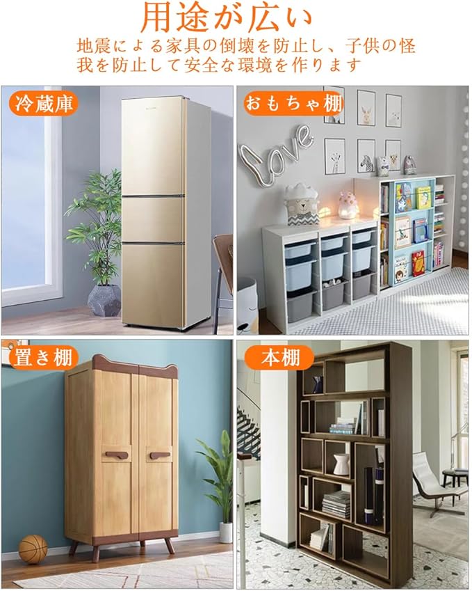 【取り付けが非常に簡単】地震転倒防止可能、家族の安全保障に不可欠の小物です!DIYが苦手な人も簡単に取り付けできます。壁や固定された物(クローゼット、棚、冷蔵庫、テレビ、モニターなど)に穴を開ける必要がなく、貼るだけで簡単に取り付けられます。 <br>【取り外しがとても簡単】取り外す必要がある場合は、ドライヤーで加熱してから剥がすことをお勧めします。