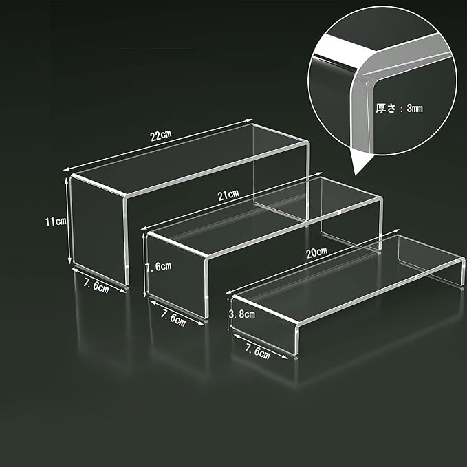 【商品仕様】展示用アクリルスタンド6個セットです。サイズ(cm):22*7.62*11、21*7.62*7.6、20*7.62*3.8各2個ずつ。材質:透明アクリル。厚さ:3mm。推奨重量は500g未満です。透明なアクリルスタンドですので、美しく展示する作品の引き立てや商品の陳列等の販売促進に最適です。