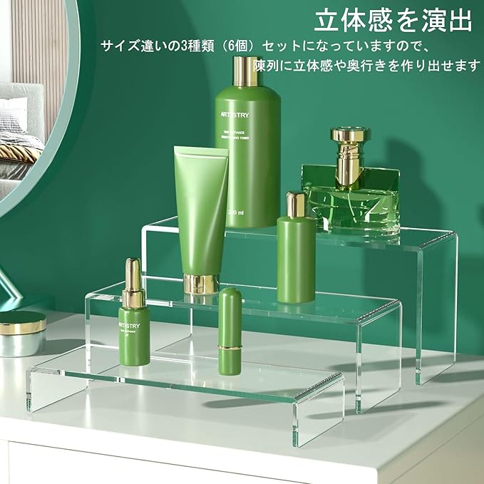 【クリアタイプ】クリアタイプですので、周囲のインテリアを選ばず、馴染みやすく、どんなお部屋の雰囲気にもマッチます。また、安定感があり使いやすく、お手持ちのアイテムが一目瞭然です。「見せる収納」で、お部屋のインテリアの一部としてスマート&オシャレにご利用頂けます。