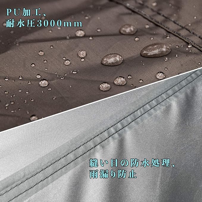 撥水加工とUVカット:Unigear キャンプ タープの素材はPU加工処理済で、耐水圧が3000mmとなり、大雨に強い。また、縫い目にはシームテープが貼られており、雨漏り防止;裏側には紫外線をカットするシルバーコーティングをが施され、暑い季節でも快適に過ごせます。