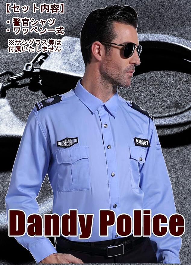 【セット内容】警官風シャツ、ワッペン4枚(肩&胸)※ワッペンの数字はランダムとなります。サングラス等のセット内容以外の小物は付属しません。