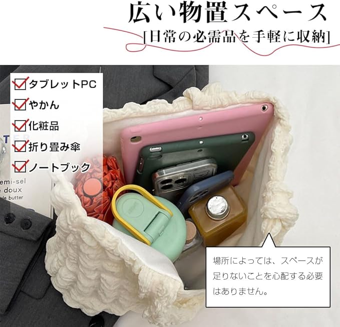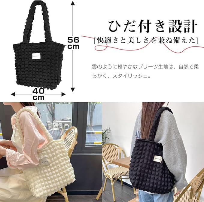 このトートバッグは、軽量で耐久性のある高品質素材、ふんわりとした褶皱デザイン、大容量収納、シンプルな無地デザインが特徴の、日常使いから通勤・通学まで幅広いシーンで活躍するおしゃれで実用的なアイテムです。