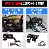 バイク用デュアルUSB+電圧計(シガーソケット付) 【デュアルUSB充電ポート】 合計出力3.4Aで、携帯電話、タブレット、ナビゲーション、GPSなどの2つの電子機器に同時に効率的に電力供給可能。 【防水・防塵カバー搭載】 環境にやさしい素材を使用した防水・防塵設計で、雨や埃から製品を守り、耐久性を向上させます。 【リアルタイム電圧監視】 搭載された電圧計がバッテリー電圧をリアルタイムで監視。低すぎる電圧や高すぎる電圧から発生する隠れた危険を防ぎます。 【車種選ばない汎用性】 DC10~24Vで多様なバイクに適応。 【独立したスイッチ】 電圧計とUSB充電ポートを同時に制御可能。オンオフを切り替えて電力消費を抑制できます。 【2通りの取り付け方法】 ハンドルバー取り付け/バックミラー取り付けが可能。自分の好みに合わせて選択できます。 【長い配線】 バッテリーに直接取り付け可能で、バイクのデザインに合わせた柔軟な設置が可能。配線手順も簡単。 【便利なアクセサリー】 ハンドルバー取付用ブラケット、バックミラー取付用ブラケット、滑り止めガスケット、長ネジ、小ネジ、固定用ナットが付属。取り付けが簡単です。