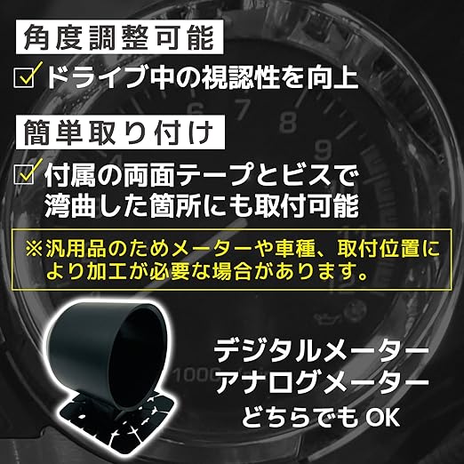 【簡単取付】このメータークランプは、付属の両面テープとビスで簡単に取り付けることができ、メーターフードパネルとして使用することができます。ダッシュボードやピラーなどの湾曲した箇所にも取り付けることが可能。メーターホルダーは角度調整ができるので、お好みの場所からメーターパーツを見やすく設置することができます。※汎用品のためメーターや車種、取付位置により加工が必要な場合があります