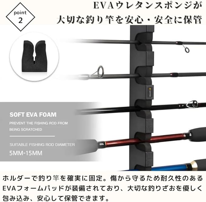 【愛竿をしっかりガード。EVAウレタンスポンジが、釣り竿を安心・安全に保管】釣り竿ホルダーには釣り竿を確実に固定し、傷から守るために設計された耐久性のあるEVAフォームパッドが装備されています。大切な釣り竿を優しく包み込み、安心して保管できることは、釣り愛好者にとって非常に重要です。