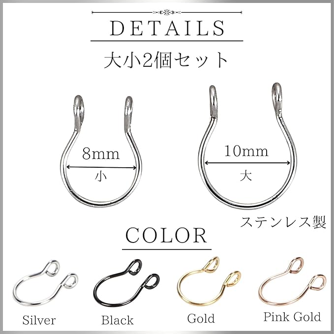 細めのさりげないフェイク鼻ピアス2個セット。大小サイズが各1個入りですのでサイズに不安のある方でも安心してお試しいただけます。ピアスホール不要のノンホールピアスなので、痛くなく手軽に楽しめるU字型アクセサリーです。 「鼻にピアスは開けたくないけど、ストリート系ファッションに憧れる」「韓国風にチャレンジしたい」そんな方に最適なフェイクピアス。ピアス穴がなくても使えるノーズカフは、ユニセックス・ミニマルデザインで、カップルやペア使用にもおすすめ。 ピアスホールがなくてもOK。挟むだけのノンホール仕様で、初めての方でも痛くない安心設計。ステンレス素材を使用しており、アレルギーに配慮した作り。鼻ピやセプタムピアスのような見た目を楽しめる、トレンド重視のアクセサリーリングです。 U字型の本体を軽く広げ、鼻(ノーズ)の中央にそっと挟むだけ。耳にも使える多用途仕様で、気分やシーンに応じて自由にアレンジ可能。ノーズリング・鼻リング・ノーズピアス風の演出も可能で、日常使いからイベントまで幅広く対応します。 セット内容は、0.8mm 8mmと0.8mm 10mmの2サイズが各1個の2個セット。2個同時に装着したり、男女ペアでのシェアもおすすめです。カラー展開はシルバー・ブラック・ゴールド・ピンクゴールドの4色。軽量で肌に優しいステンレス製。