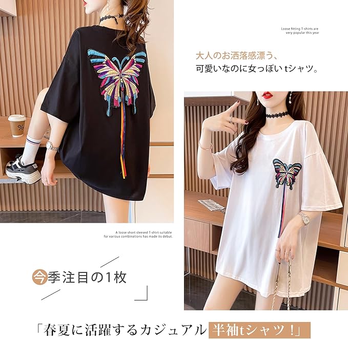 [HuuMeNEIDOO] tシャツ レディース 半袖 ロングtシャツ 刺繍 蝶柄 ティーシャツ 丸首 トップス カットソー プルオーバー ゆったり 体型カバー オーバーサイズ 速乾 韓国 ファッション 普段着 春 夏 秋