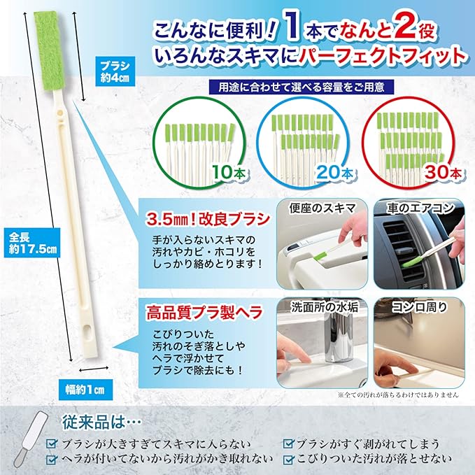 【商品仕様】1本サイズ:全長約17.5cm (ブラシ部分長さ約4cm /持ち手部分約13.5cm /幅約1cm /ブラシ部分厚み約3.5mm) 30本入り 。当社の 掃除 ブラシ は便座の隙間、洗面所の水垢、キッチンのコンロ周り、洗濯機の隙間、水筒 ブラシ、溝ブラシ 車のエアコン など多機能にも利用可能。また、持ち手の先端は汚れをそぎ落せるヘラ付へ改良しました。