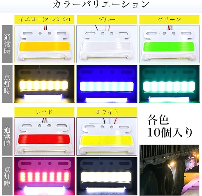 トラックやトレーラー、デコトラなどに取り付けるサイドマーカーです。 高輝度COB LEDを採用し、ステー付きの一体型にすることで極薄サイズを実現しました。 補修や修理、視認性アップだけではなく、カスタム、ドレスアップ用としてもお楽しみください。