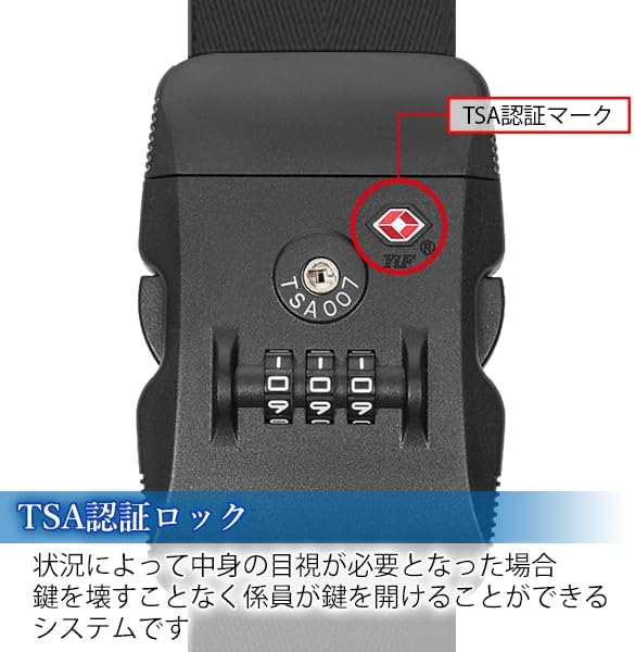 TSA認証ロック付きのためTSA職員が手荷物をチェックする際、ベルトやロックを壊すことなく中身を確認できるので安心です。