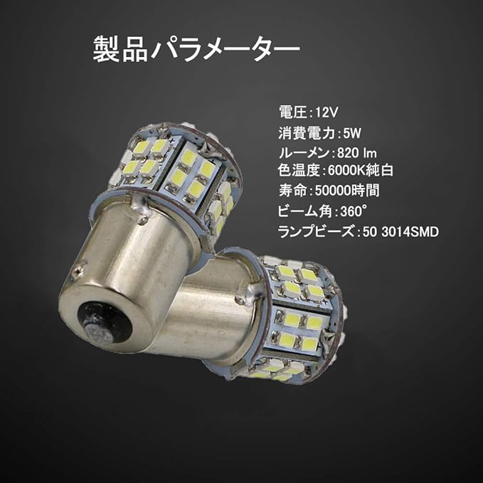S25 シングル球 LED(P21W 1156 S25 G18 BA15S)バックランプ 1206SMD 50連 ホワイト ピン角180度 6000-6500K 12V車用 10個入り