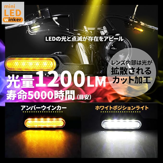 バイク用LEDウィンカーは、3段階点灯するシーケンシャル機能付き。内側から外側に流れるライトで、レンズ内部は光が拡散されるようカット加工。光量1200LMの高輝度LEDで夜間や悪天候でも視認性も◎。