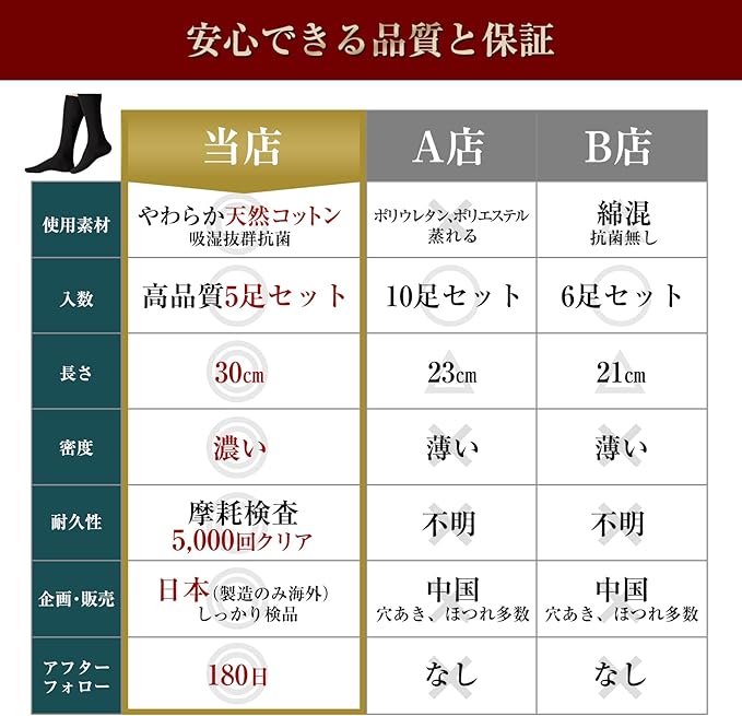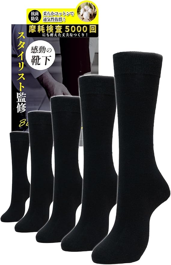 【工場出荷数20万件・摩耗検査合格5000回以上】安心の高品質。使いやすいロング丈・黒色・やわらか天然コットン使用。便利な5足セット。防臭抗菌でニオイを防ぎ、適度な厚みがあって耐久性十分。スタイリスト監修品。アフターフォロー180日付き。
