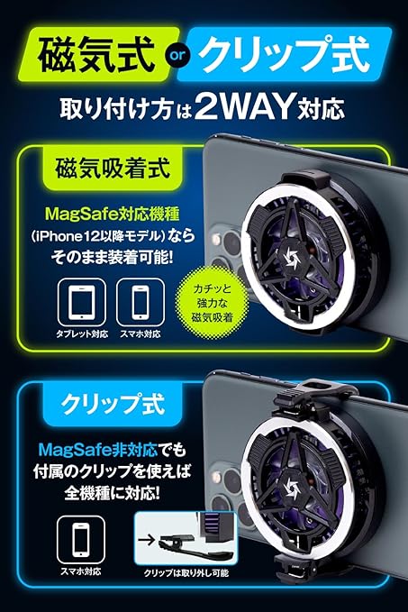 【注意事項】1.スマホに装着していない状態で作動させた際に冷却面が結露することがありますが、正常動作によるものです。 2.動作中はファンの通気口を塞がないでください。排熱できず、発熱する恐れがあります。 3.高温・高湿度な場所は避けて保管してください。