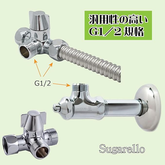 接続部はG1/2規格となっているので、ほとんどのシャワーホースを接続することができます。シャワーだけでなく、洗面所やトイレの止水栓に取付て分岐させることができます。使い方いろいろ。