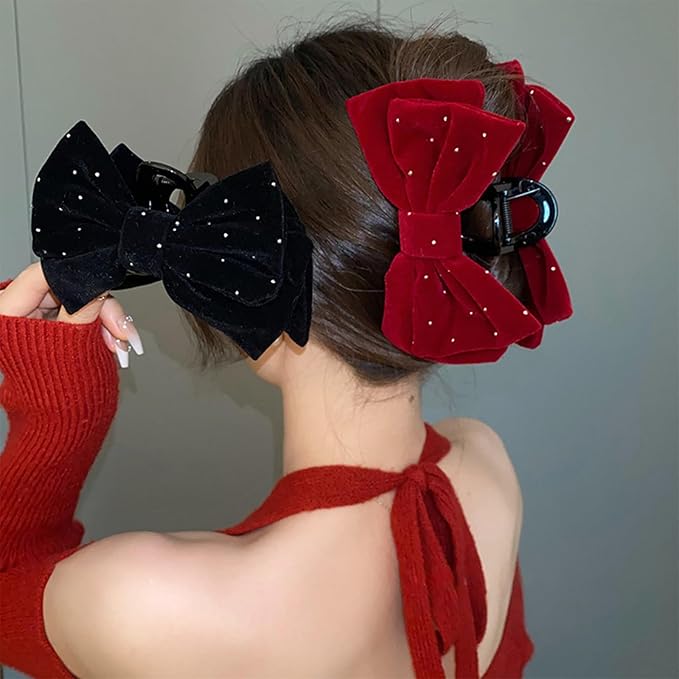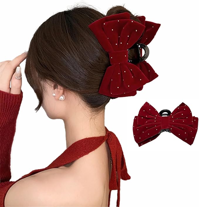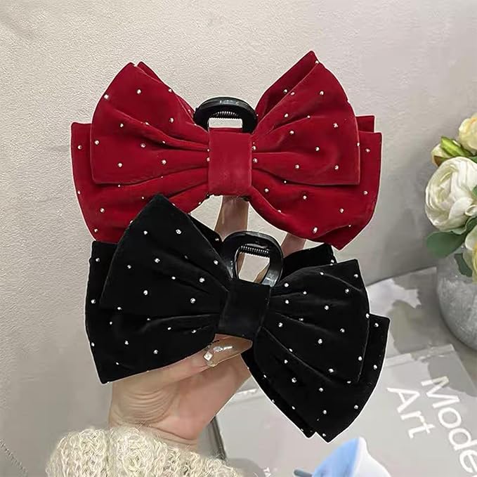 ヘア クリップ AUTAKI ヘアクリップ 大きめ リボン ベロアタイプ ラインストーン バンス リボン 可愛い 大人っぽい 、 しっかりとまる バンス 髪留め 華やか アクセサリー 髪留め 韓国風 上品 まとめ髪 シンプル 贈り物 レディース用 おしゃれ (レッド 深紅)