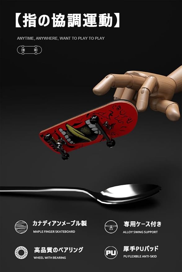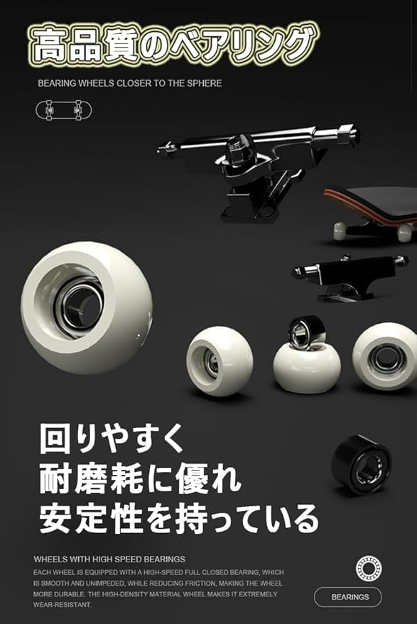 【耐久性メープルデッキ】高品質のベアリングを使用で、回りやすく、耐磨耗に優れ、安定性を持っている。滑らなくてボードに乗ることができます。大人でも子供でも使えます。持ち運びが簡単で便利です。流暢な体験を提供し、効果的に摩擦を減らし、指スケートボードの寿命を延ばします。