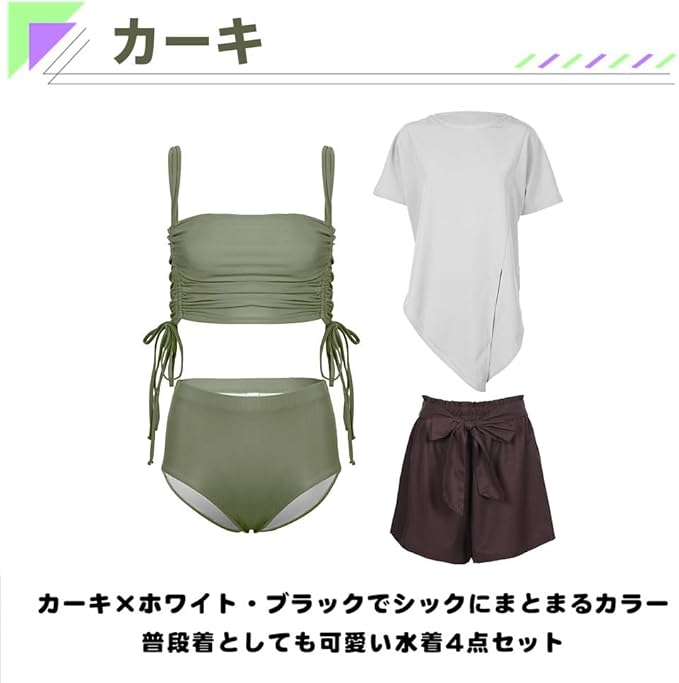 [HOYUKI] 水着 レディース 体型カバー ビキニ 半袖シャツ ラッシュガード Tシャツ ショートパンツ 4点セット クロップド丈 セパレート ギャザー 無地 ママ水着 おしゃれ 普段着 リボン 二の腕 ウエスト お尻 サウナ 205t11s56 | etshop