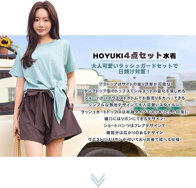 大人可愛いラッシュガードセットで日焼け対策! HOYUKIの4点セット水着 ブラトップはサイドの絞り調整が可能な タンクトップ型のトップスでシルエットの変化を楽しめる ショーツはハイウエストボトムでお腹周りをカバーできる シンプルな無地デザインで大人可愛いスタイルに! ラッシュガードトップスは半袖タイプでスッキリとした印象に 裾口にはリボンにできるデザイン! ショートパンツはフレアデザインで裾部分は広がりのあるデザイン ウエストにはリボンが付いており前後で結べる仕様!