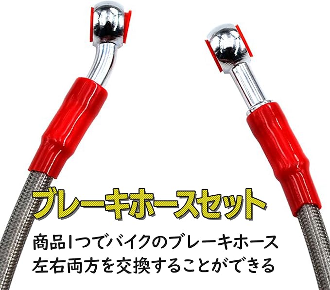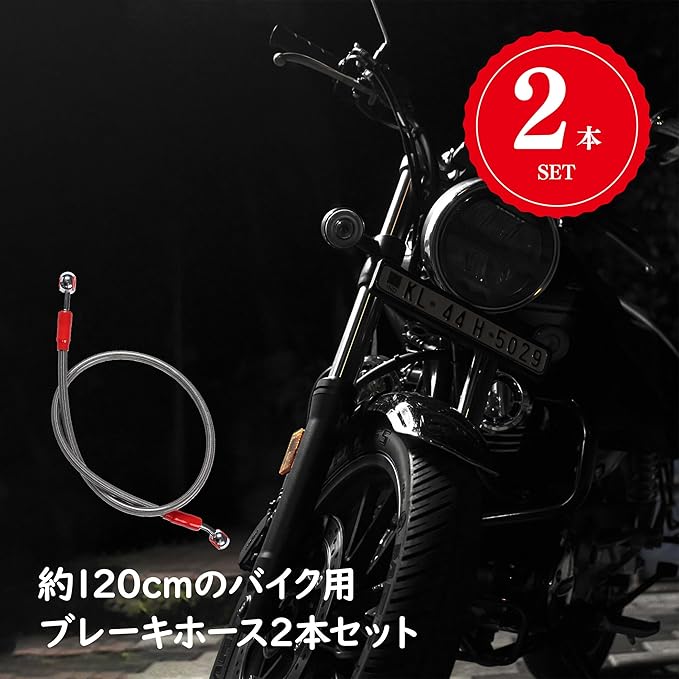 ブレーキホース2本セット:バイク用の約120cmのブレーキホースの2本セットです。この商品1つでバイクのブレーキホース左右両方を交換することができます。しっかりとしたステンレス製で、強度も抜群です。断熱性に優れたPVC素材で覆われているので、ホースの膨張や破損などの問題が起こりにくいです。