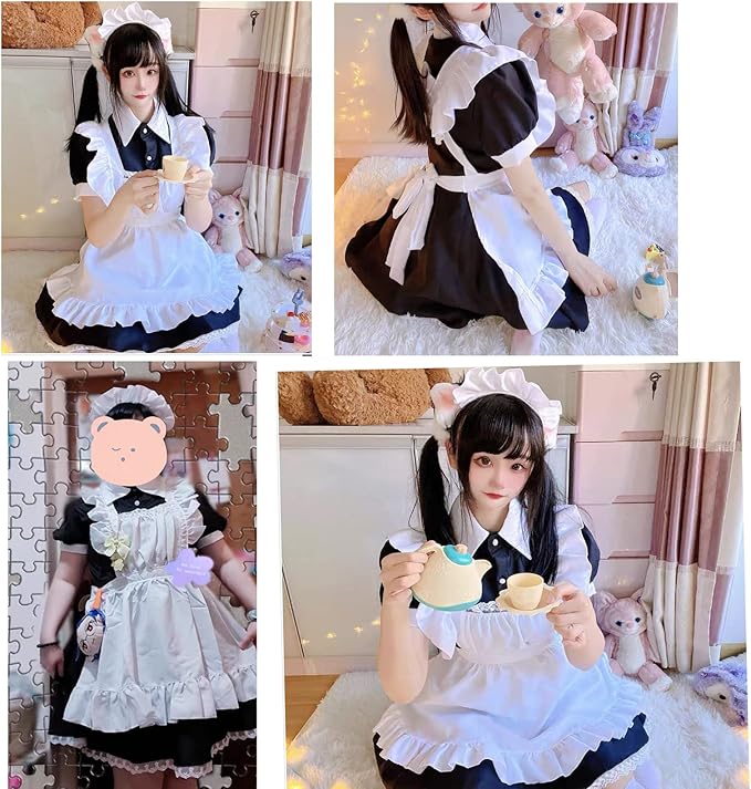 [FULINE] メイド服 コスプレ コンカフェ メイド エプロン 定番 ショート丈 メイドコスチューム 仮装 レディース メンズ セット 一式 こすぷれ イベント パーティー 大人 男女兼用 ブラック L