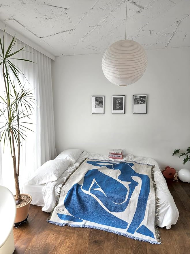シンプルで少し寂しいと感じるベッドルームのインテリアにおすすめなベッドスロー。 ソファやイスに掛けたり、ラグとしても多様に活用して頂けます。 こちらは19~20世紀に活躍したフランスの画家兼彫刻家、“アンリマティス Henri Matisse ”の作品ブルーヌードのデザインを取り入れたものです。マティスが好きな女性のポーズを切り絵で表現しています。 裏表で色が反転するリバーシブルデザインですので、気分やインテリアに合わせて使い分けて頂けます