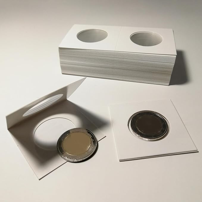 カラー: ホワイト; 材質: 紙; コインサイズ: 29 mm; サイズ: 50 x 100 mm(L*W); パッキングリスト: 50 x コインディスプレイホルダー