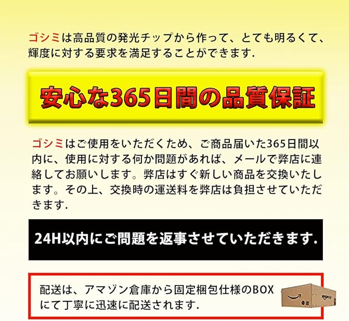 このランプは特別に【12V自働車】のためにデザインされて、電圧範囲DC9V-24Vは、一部の24V車両に適用されて、24V以上の超大型車両(例えばトラック)に適用されていません、一部の大型車両の起動瞬時電圧は30Vに達する可能性がありますが、電圧の冲撃により車のランプ寿命が深刻に低下します(数日または1、2ヶ月LEDが消えて、点灯しません)。以上のような現象が発生した場合、車両ランプの品質問題には該当しない。24V車の所有者は、このライトを慎重に購入し、この注意事項をご覧下さい。
