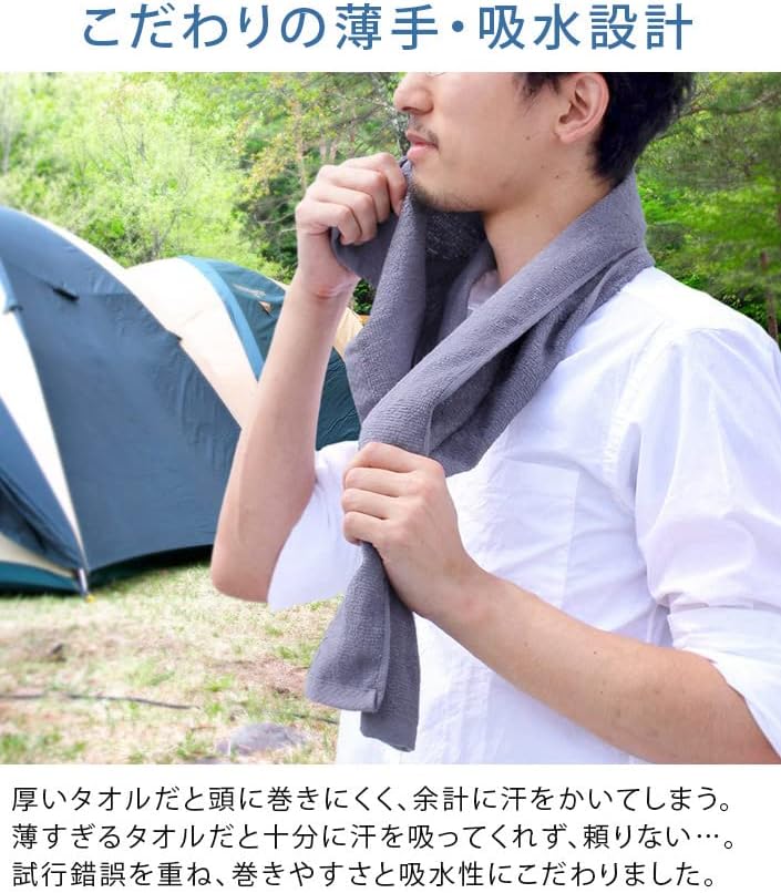 【頭に巻けるロングサイズ】タオル職人のこだわりが詰まった「男性のためのタオル」。通常のフェイスタオルと較べて、少しだけ丈が長いのがこのタオルの特徴。お仕事中、ジョギング中、お風呂上がりのヘアドライ…色んなシーンで頭に巻く時に、この「ちょっとだけ長い」というのが便利なんです。薄手タイプなのでしっかり結びやすいので、作業中にほどける心配はありません。