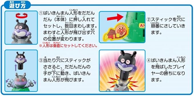 あたりの場所に差し込むと、ばいきんまん人形がポンッと飛び出す、ハラハラドキドキのゲームが楽しめます!
