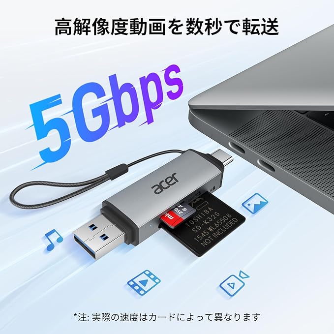 【USB 3.0 + USB-C】Acerのメモリーカードリーダーは、USB-AおよびType-Cの2つのインターフェースを搭載した多機能SD/TFカードリーダーです。USB-AまたはUSB-C対応デバイスと幅広く互換性があり、最大5Gbpsの高速転送に対応。1GBのファイルも数秒で移動できる、利便性の高いカードリーダー SDです。