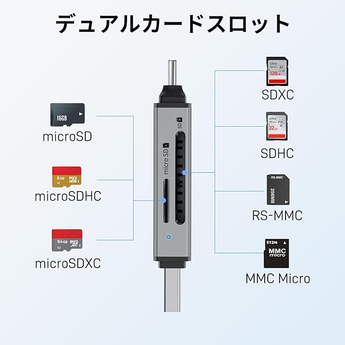 【同時読み書き対応・利便性向上】頻繁なカードの抜き差しを減らすため、デュアルスロット設計を採用したマイクロSDカードリーダーです。microSD、SDXC、SDHC、MMC、RS-MMC、microSDXC、microSDHCなど、最大2TBのメモリーカードを同時に読み書き可能。UHS-I規格に対応し、最大転送速度は104MB/s。【 実際の速度はご使用のカードによって異なります。】