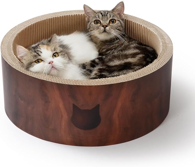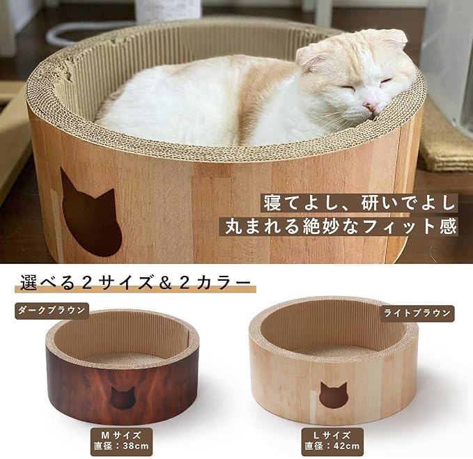 バリバリサークルラージは、名前の通り猫がまんまるく丸まってくつろげる円形ベッドです。段ボール製なので、つめとぎとしての使用も可能。内側スペースを直径42cmの広め設計なので、猫がまんまるく丸まった時に窮屈すぎず、広すぎず、絶妙なフィット感です。高さ16.5cmで隠れ家感も演出。