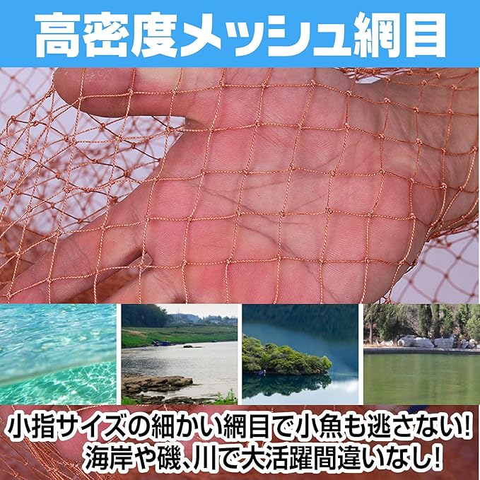 使用上の注意1:底に網が引っかかり、網が引き上げられなくなり破れる場合があります。また、カニ網として利用した場合、カニの爪で破れる場合があります。直射日光は網の劣化を早める原因となるため、網が乾いたら直射日光を避け保管ください。