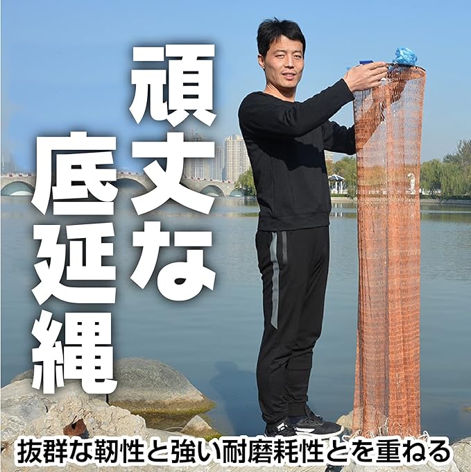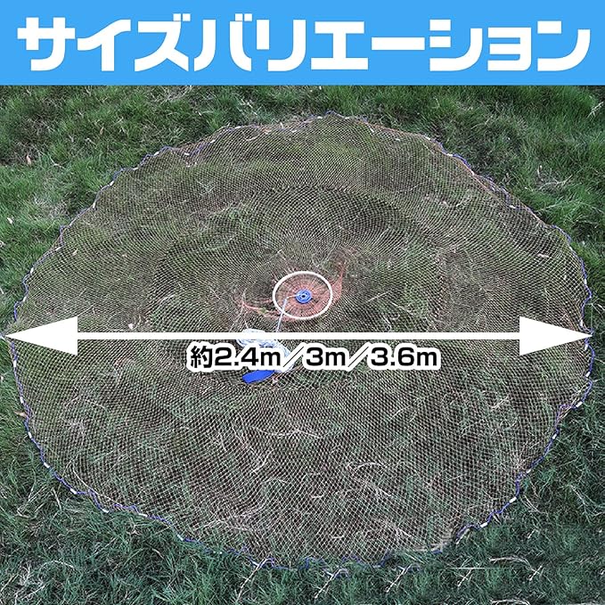 投網サイズ(直径):約2.4m、約3.0m、約3.6m 手綱(たづな):約10m パケージ内容:投網、投げ方マニュアル 【推奨年齢】14才以上 ※モニターの環境により、色の見え方に若干差が生じる場合がございます。
