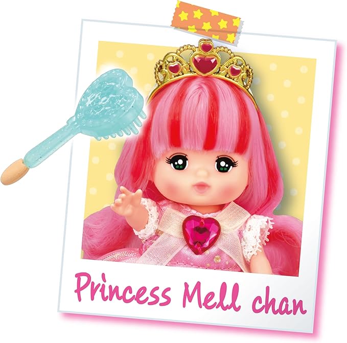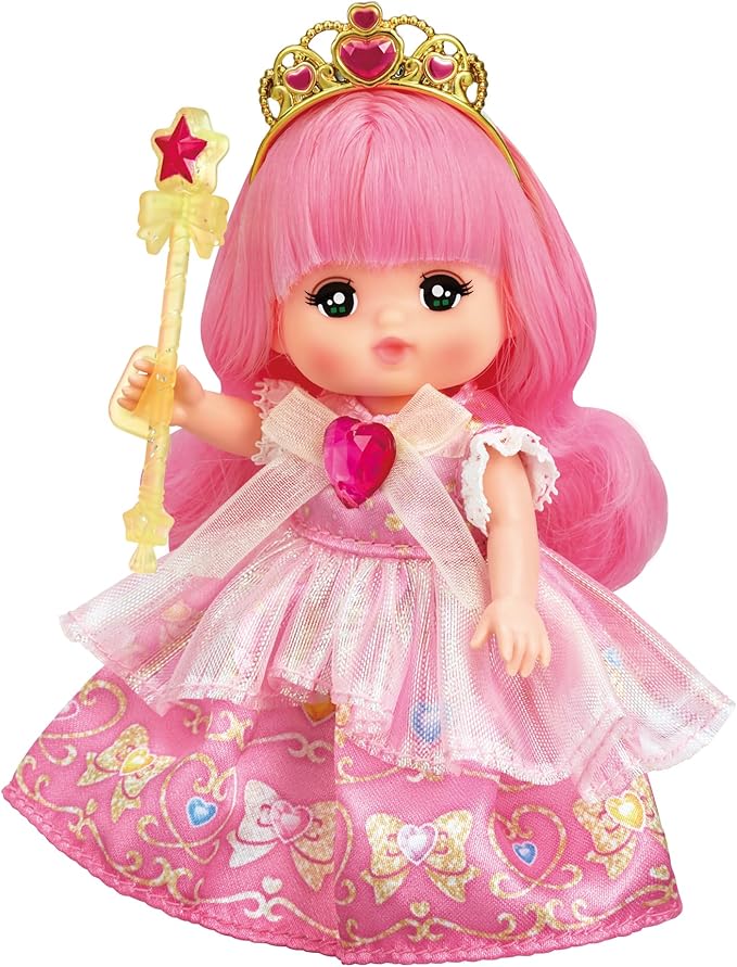 セット内容:プリンセスメルちゃん(パンツ・ドレス)、サンダル、ハートのティアラ、ステッキ、ブラシ、ミニガイド