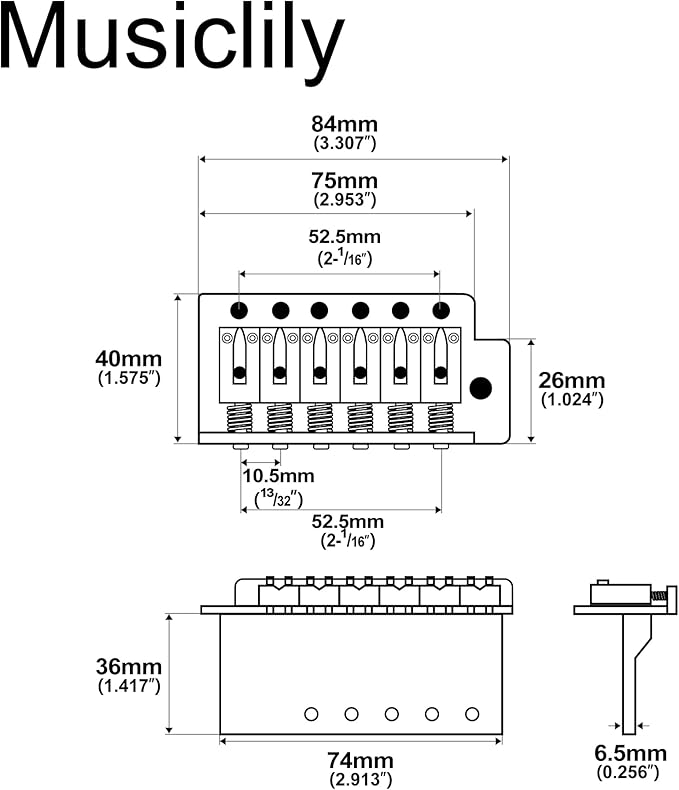 Musiclily Pro 10.5mmモダン6点止めトレモロユニットブリッジ 36mm ショートブロックSquierストラトエレキギター用、クローム
