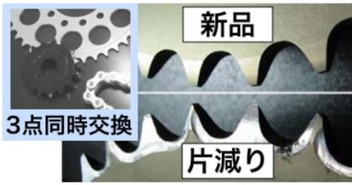 スプロケットは消耗品です。一般走行時目安として約1000km走行ごとにスプロケットの点検を行って下さい(日常の注油により、スプロケット及びチェーンの寿命は格段に向上します)。