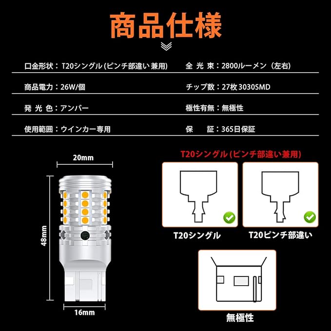【ハイフラ防止機能内蔵】T20 LED ウィンカー 通常のLEDは純正球より消費電力が低いので、玉切れを起こしたと認識し誤作動を起こしてしまいハイフラ状態になります。そのために、別途ハイフラ対策をする必要があります。本製品は、小型のハイフラ抵抗をバルブ内に内蔵しているので、面倒なハイフラ対策・加工は必要がありません。