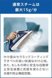 スチームアイロン、パワフルスチーム セラミックかけ面 適度な重さで、素早く、簡単にアイロンがけができる。