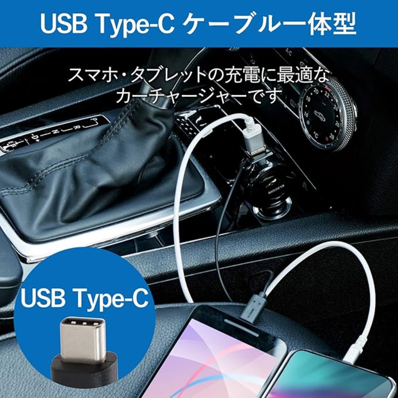 USB Type-Cコネクタに対応。 巻取り式のUSB Type-Cコネクタと、おまかせ充電に対応したUSBポートを搭載し、2台のスマホを同時に充電できる車載充電器。