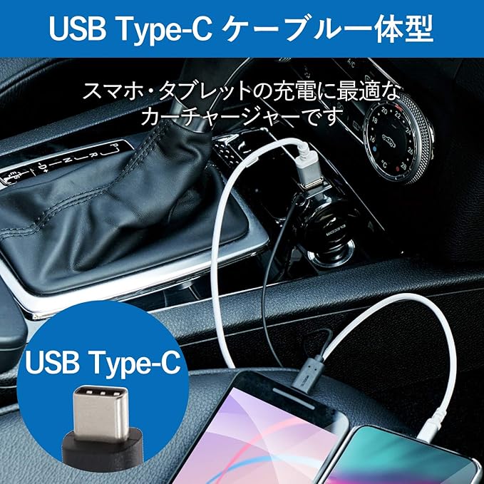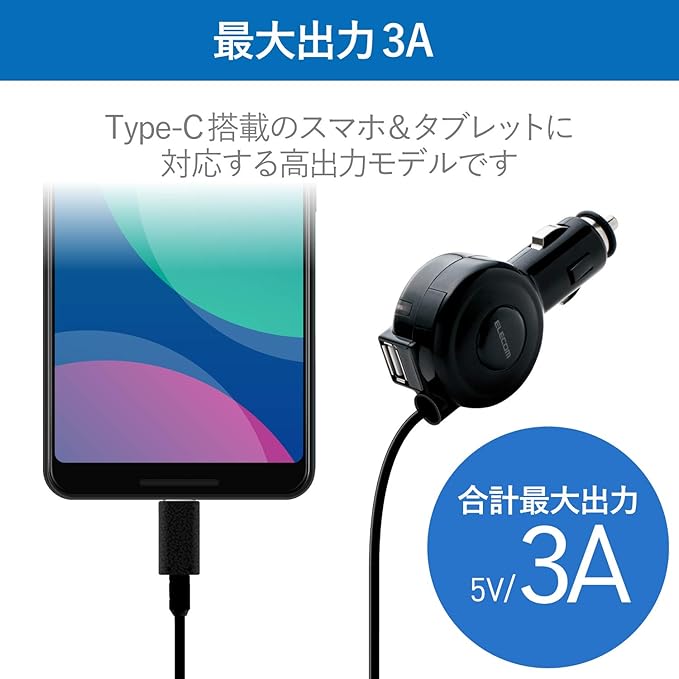特徴 USB Type-Cコネクタに対応! 巻取り式のUSB Type-Cコネクタと、おまかせ充電に対応したUSBポートを搭載し、2台のスマホを同時に充電できる車載充電器。