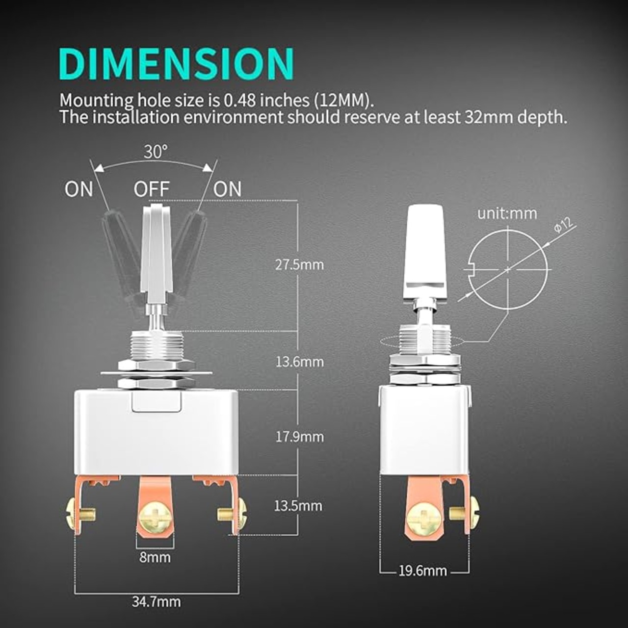 この 3 ウェイ トグル スイッチの取り付け穴の直径は 0.48 インチ (12mm) です。 簡単かつ迅速な接続のためのネジ端子。