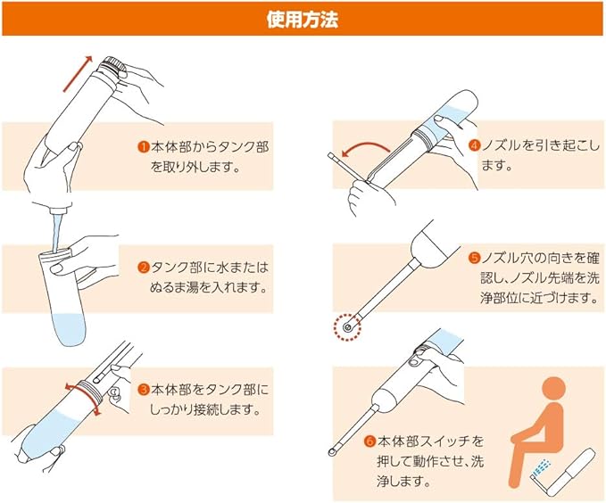●本製品を洗浄以外の目的では使用しないでください。●ノズルを体内に挿入して使用しないでください。●本製品は完全防水ではありません。水や熱湯をかけた5歳以下の幼児の手の届かない場所でご使用ください。●本