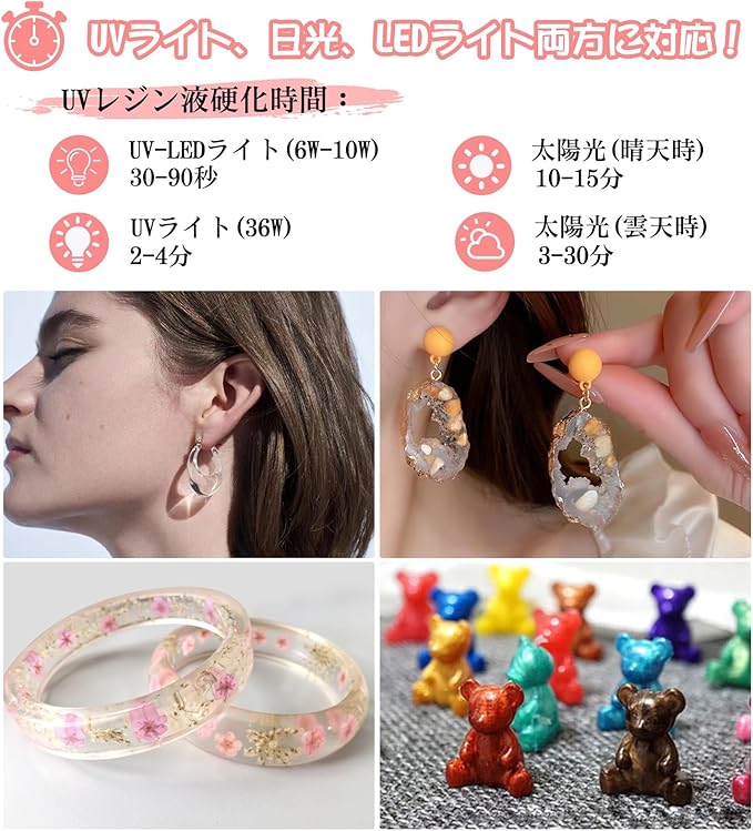 UV-LEDサポートと速い固形:UVレジン液は紫外線ランプやLEDランプと組み合わせて使用できます。高温の影響を受けやすく、硬化に要する時間が非常に短いです。太陽光でも簡単に液体を硬化させることができます。粘着感が少ないので、次の工程に素早く移行できます。経験者も初心者も使いやすいです。
